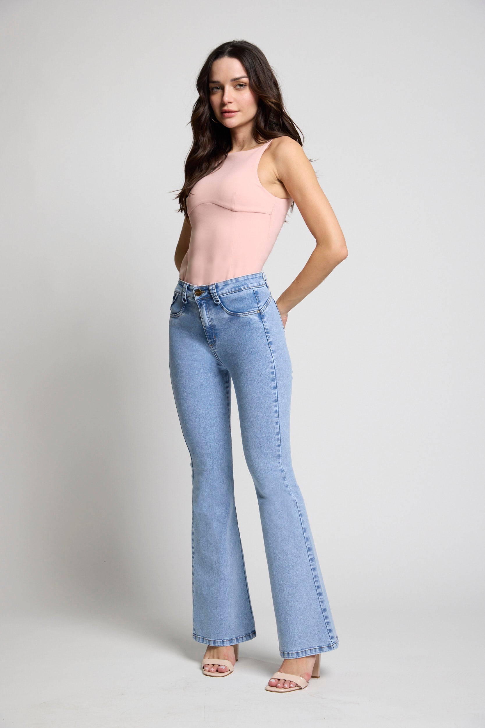 Jeans High waist flare Agata, color celeste, largo normal. Tela Stretch Denim con la elasticidad precisa para dar formar manteniendo la comodidad necesaria.