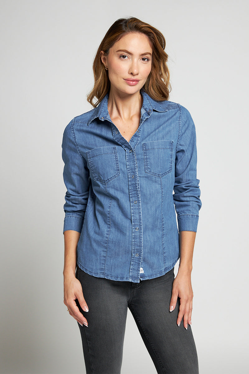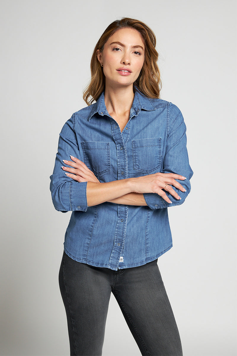 Camisa denim Clásica con stretch, color azul claro.