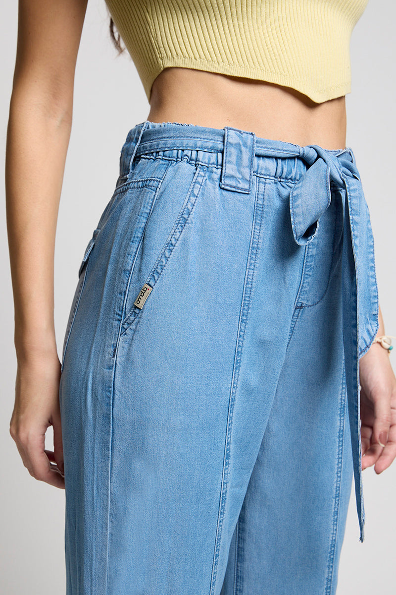 Pantalón de verano con lazo, color celeste, largo normal. Tela Tencel, fibra natural. Fibra natural,con indigo.