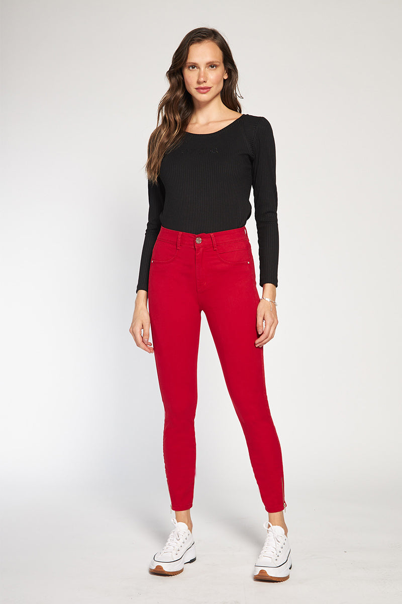 Coral Jeans con push up, color rojo y largo normal.