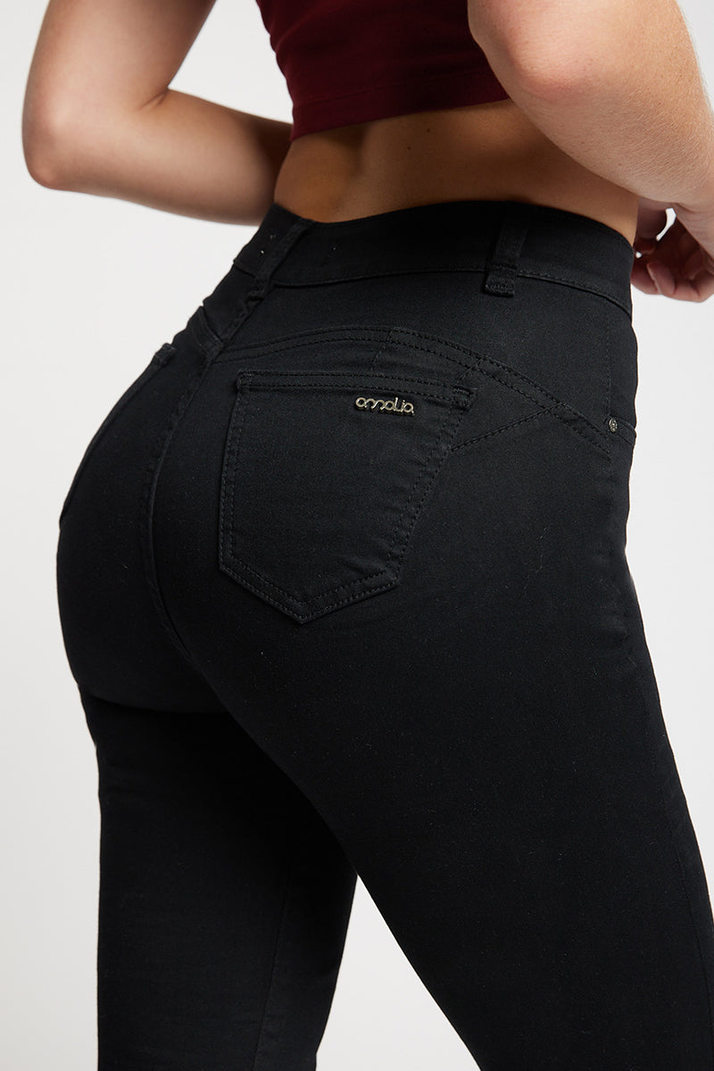 El Jeans High Waist Flare Agata Negro destaca por su moderno corte de tiro alto y bota acampanada en largo crop, una combinación diseñada para estilizar tu figura con un aire sofisticado.