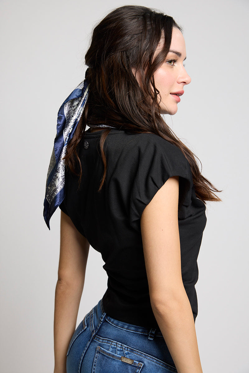 Polera con recogido englobado y abierta en la parte delantera, color negro y calce semi-ajustado