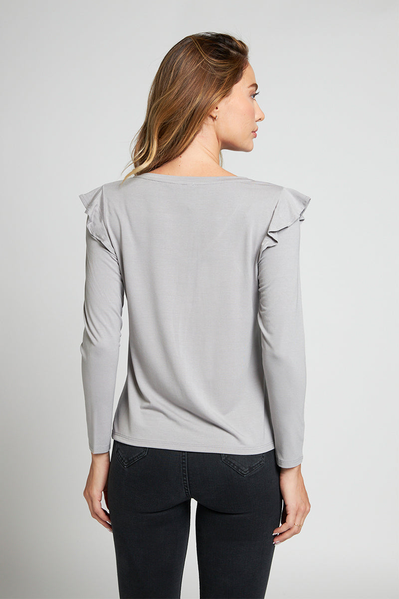 Polera Amalia Sustentable, manga larga con vuelos, color gris.